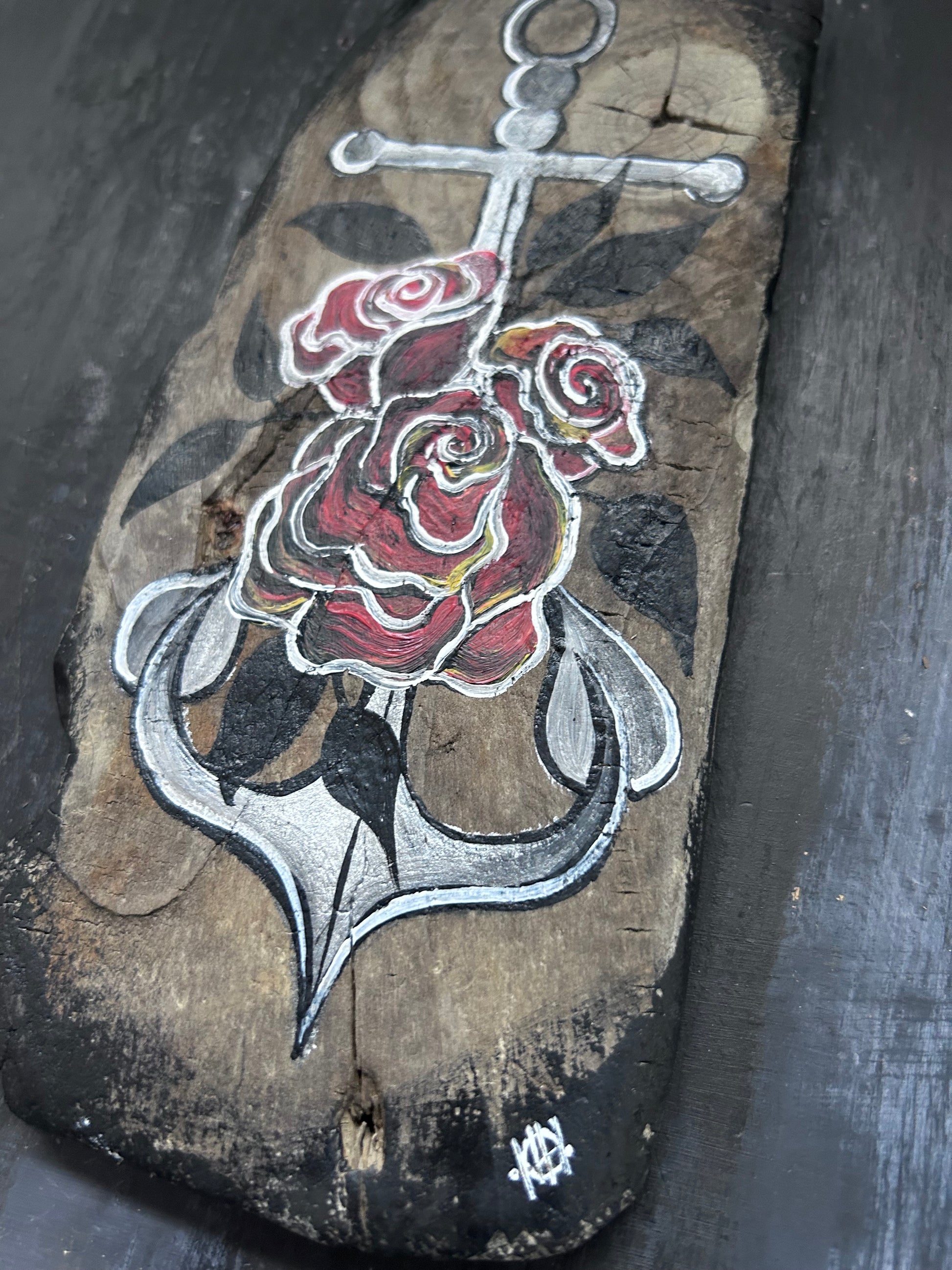 Here I have for sale an original painting on a piece of driftwood salvaged from a beach in Northumberland.